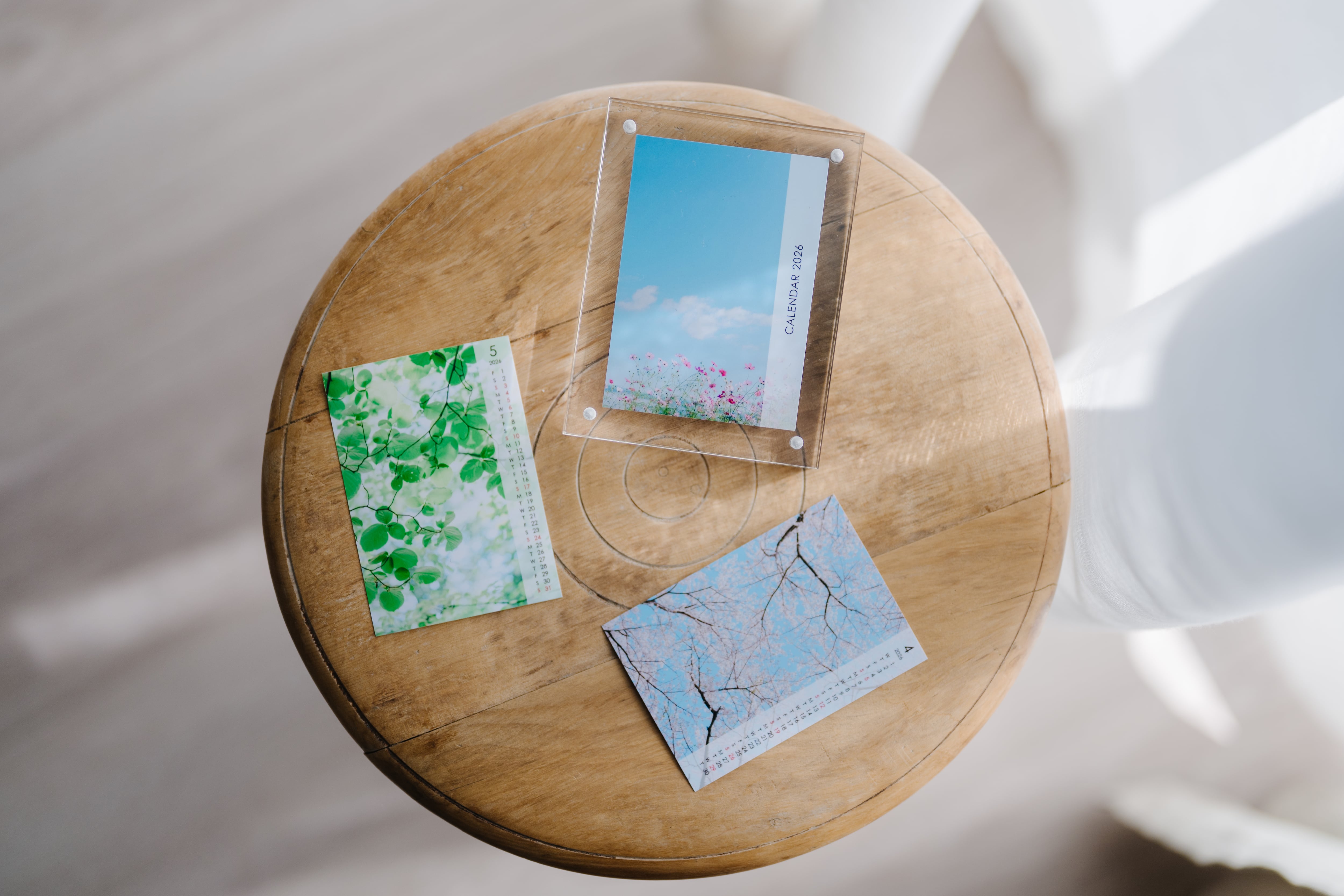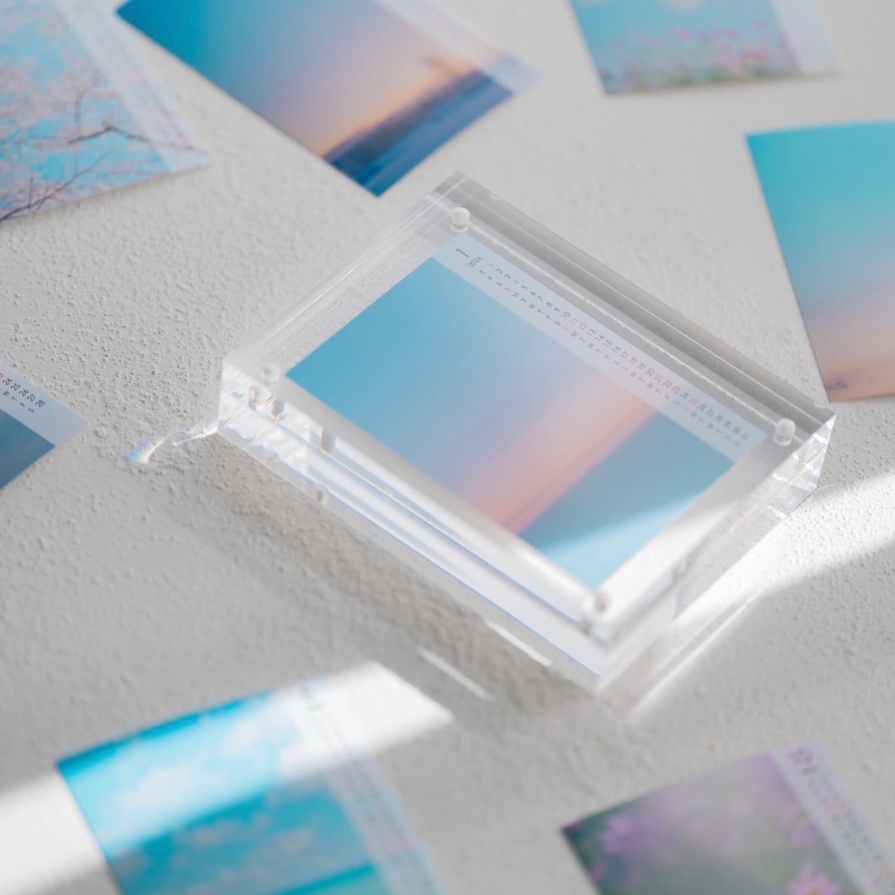 透明感のあるアクリルフレームに挟んで飾る、2026年版オリジナル卓上カレンダー〈アクリルmini〉。ふんわりパステルな季節の写真で綴った、コンパクトながら写真を美しく楽しめるカレンダーです。