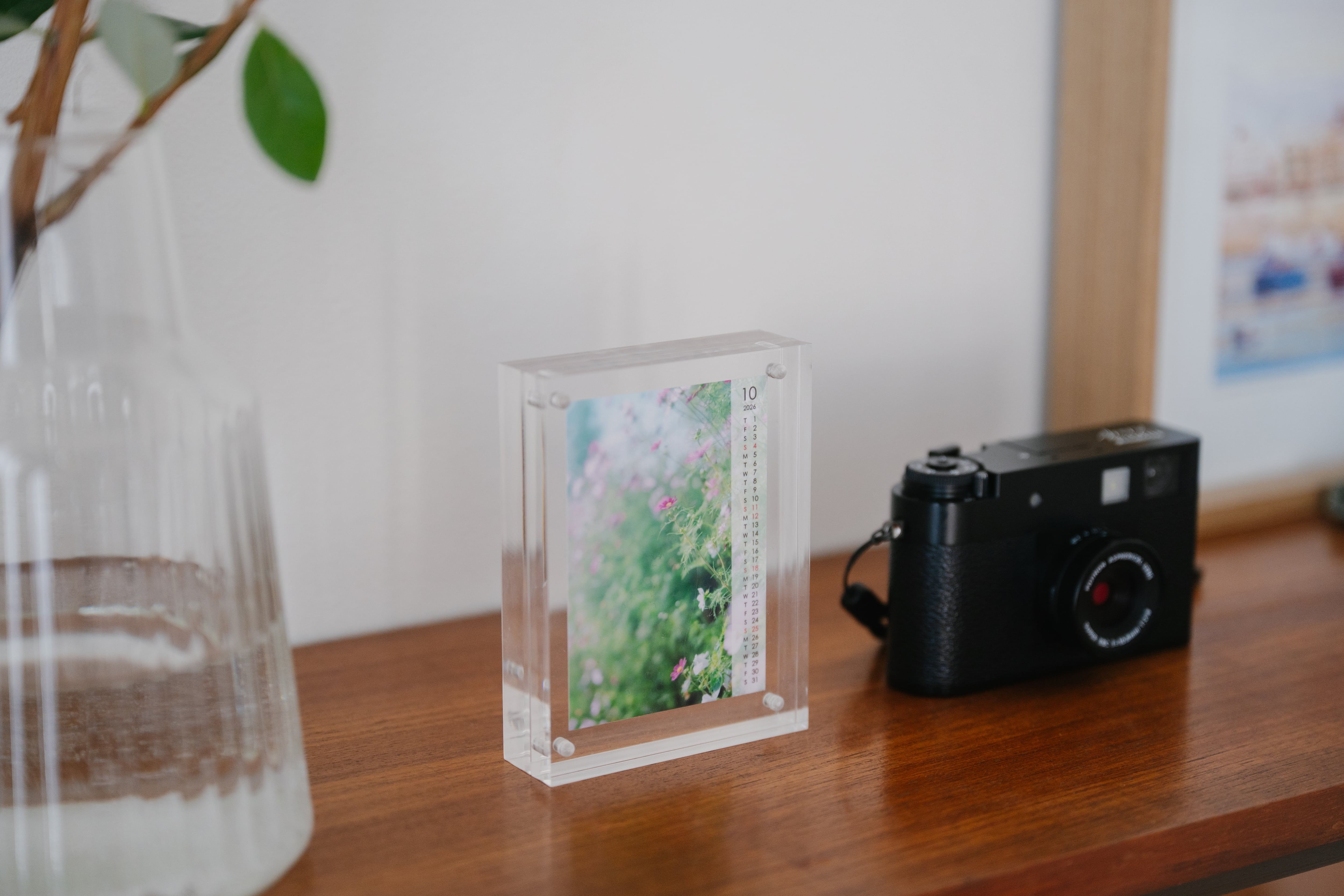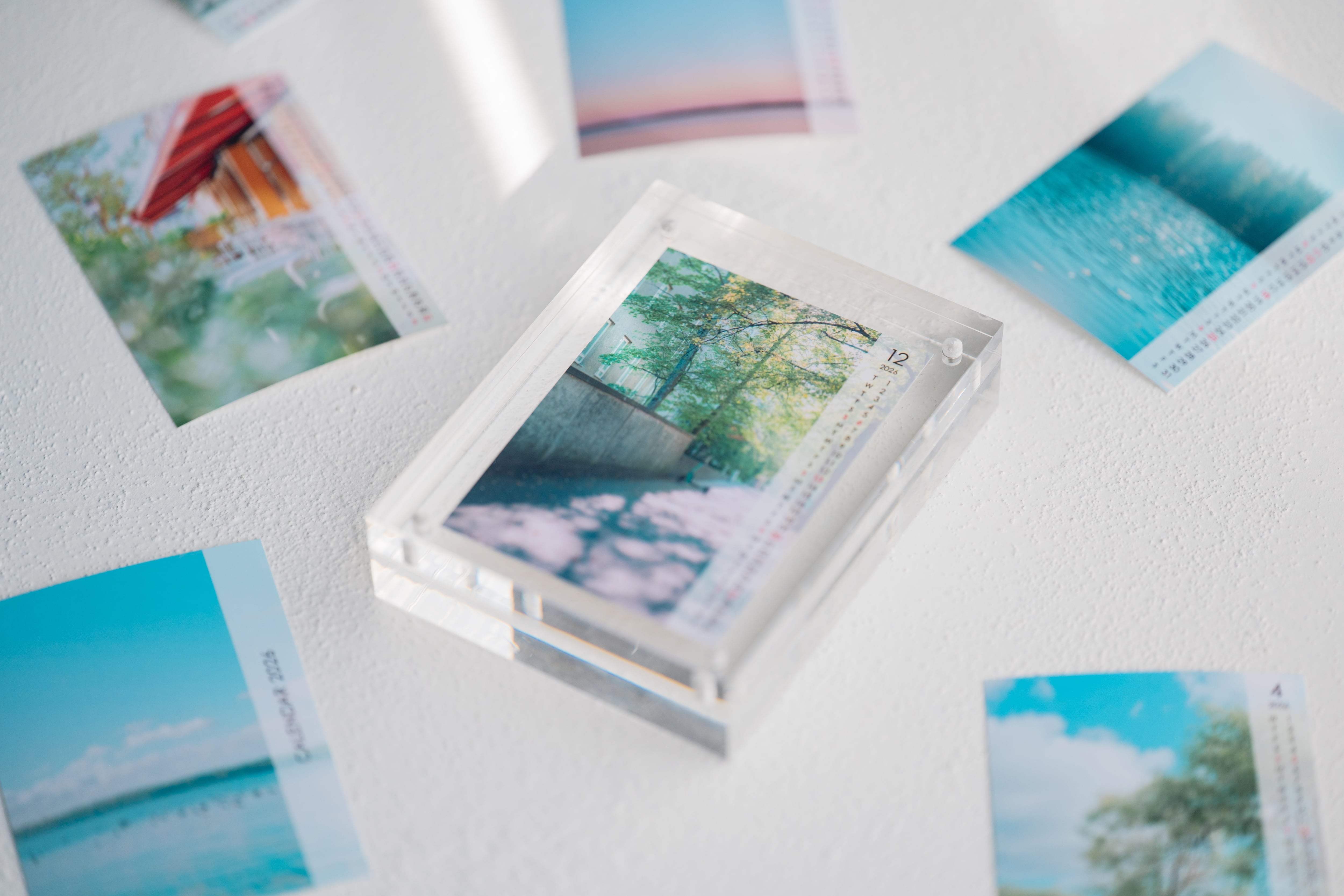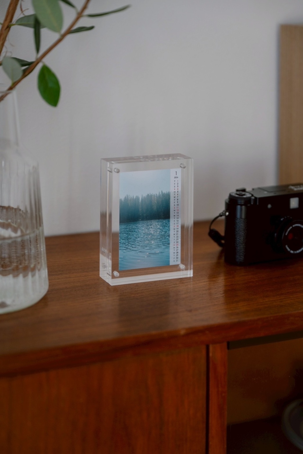 透明感のあるアクリルフレームに挟んで飾る、2026年版オリジナル卓上カレンダー〈アクリルmini/北欧旅写真〉。